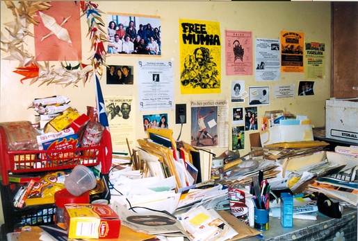 Kitchen table at the Kochiyama home. Here you can see various protest and conference flyers, pens, letters addressed to friends and political prisoners across the nation, envelopes and newspaper clippings.
